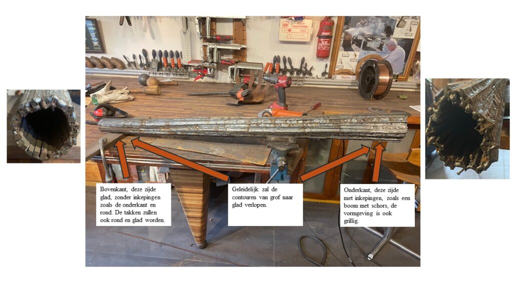 De wortels geven de voeding door aan de stam. De contouren kunnen iets anders gaan lopen, ik moet de buitenkant aaneen smeden en lassen waardoor er iets ander lijnen kunnen ontstaan maar in grote l... Lees meer